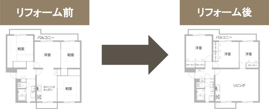 たとえば図のように、ダイニングキッチンと和室の2部屋だった間取りを、ひとつのリビングにすることで、ゆったりと快適なリビング空間を創り出すことができます。