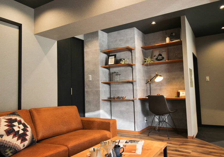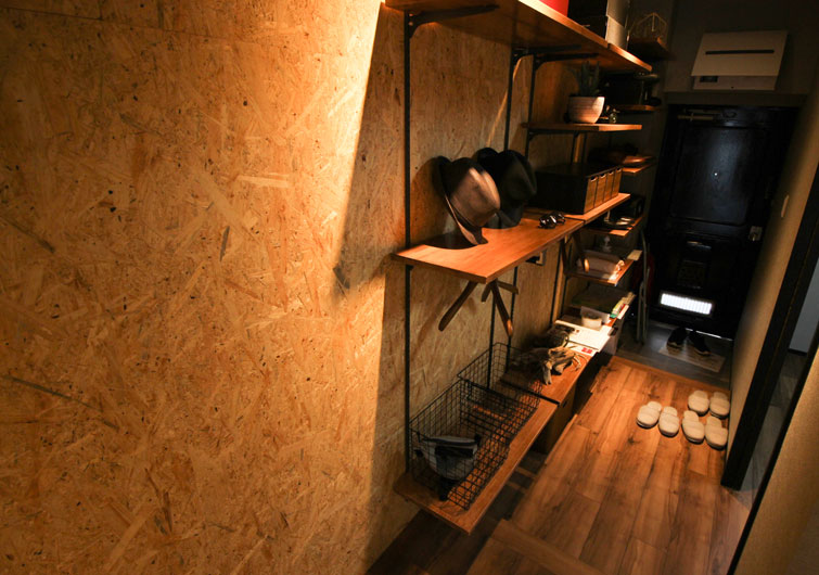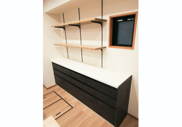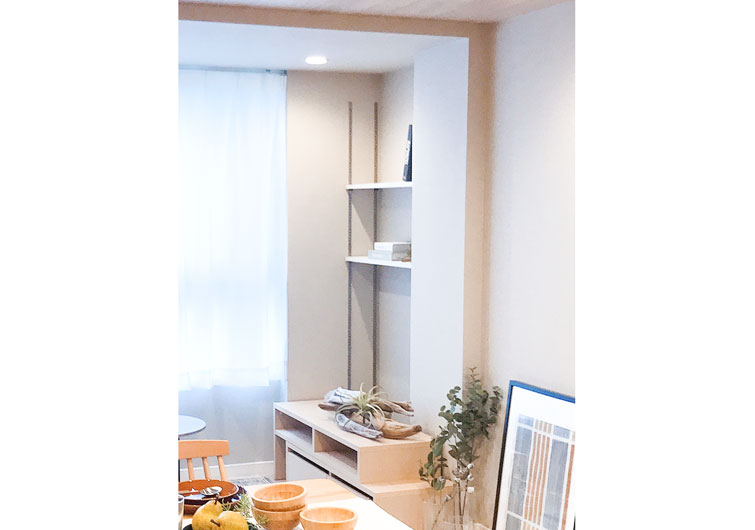 画像は東京都板橋区にある築19年(床面積71㎡・間取り2DK)のお宅です。リビングの一角に収納スペースを新設し、棚を設置しました。