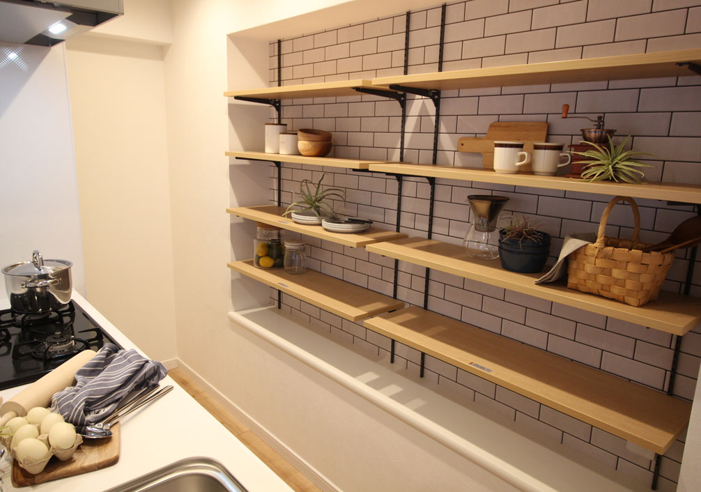 たとえば上の画像は、既存の間取りを活かして可動棚を設置し、「見せる収納」を実現しています。置く物によって高さを自由に調節できるので、とても便利です。