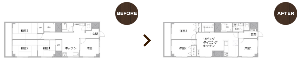 これまで和室が3室あり、ダイニングキッチンのスペースが非常に狭い状態でした。そこで、和室のうちの一部屋を潰し、カウンターキッチンのリビングダイニングにリフォーム。家族が楽しく集える、広々としたリビングダイニングが実現しました。