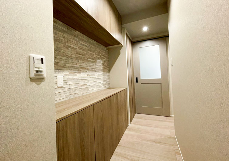 以前は壁面収納が玄関スペースを圧迫していましたが、今回の工事で「カウンター+吊戸棚」タイプの収納に変更。目線の高さに余白が生まれ、すっきりとした印象に。