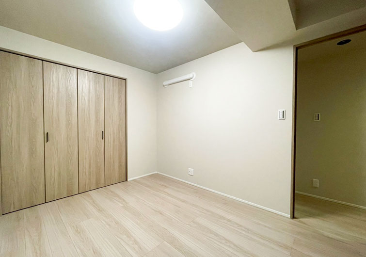 洋室(以前はウォークインクローゼットとして使用していたお部屋)とキッチンの間に、間仕切り壁を新設しました。 キッチンと隣接する空間をしっかり区切ることで、生活動線がより明確になり、お部屋としての使い勝手も向上しました。 また、壁を設けることでキッチンからの音や匂いが軽減され、快適にお過ごしいただける空間へと生まれ変わっています。