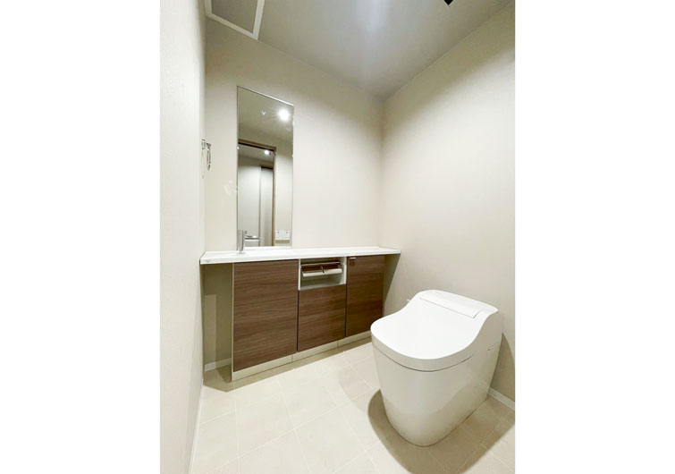 タンクレストイレを引き続き採用し、すっきりとした空間に。 手洗いキャビネットには INAX「キャパシア」(紙巻器付サイドベースキャビネット)を選びました。 座ったままゴミを捨てやすく、扉を閉じればサニタリーボックスが隠れる仕様で、清潔感と使いやすさを両立しています。