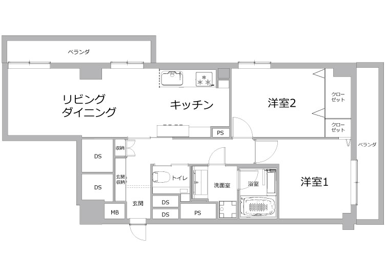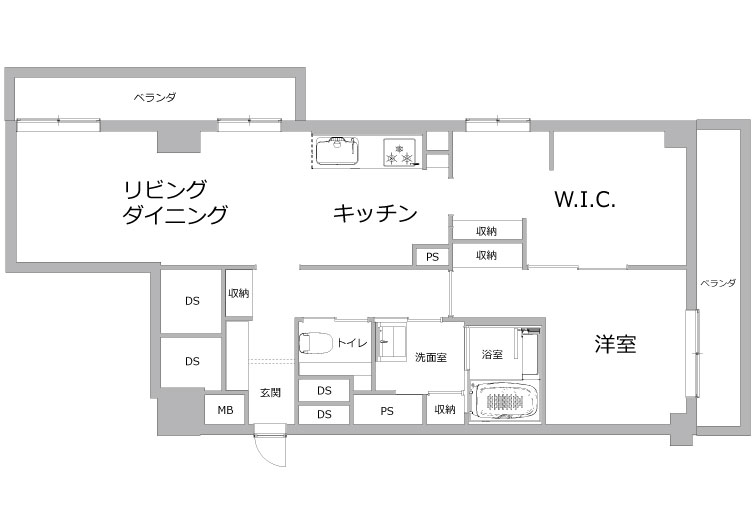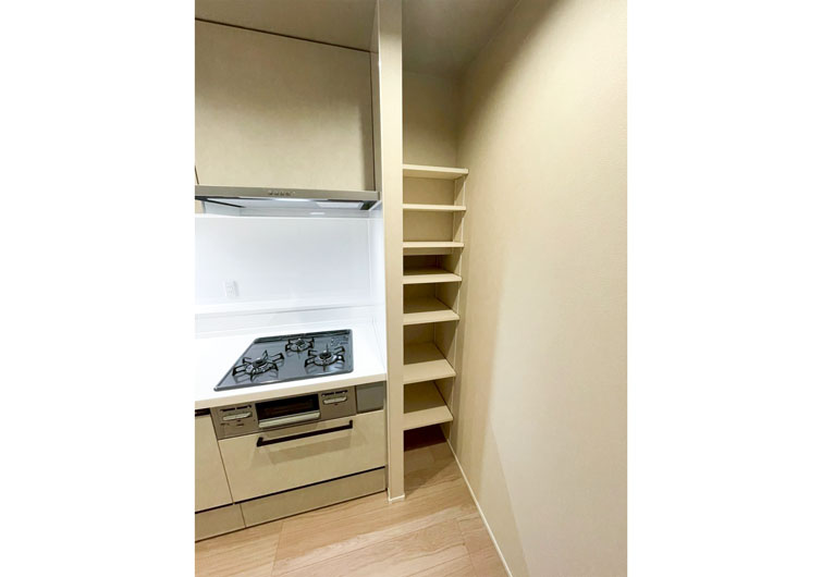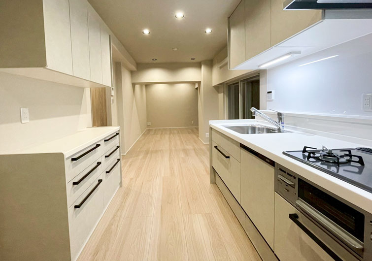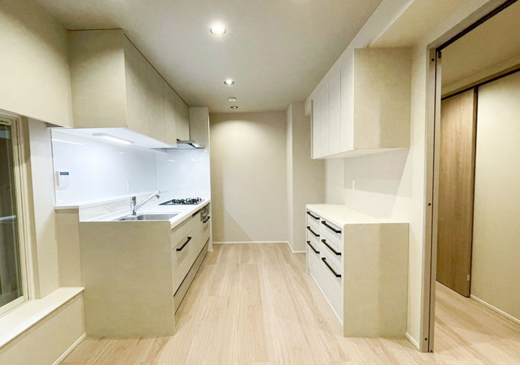 これまでダイニングキッチンや洋室から一続きだったウォークインクローゼットを撤去し、キッチンに間仕切り壁を新設。