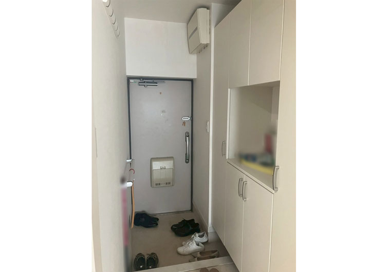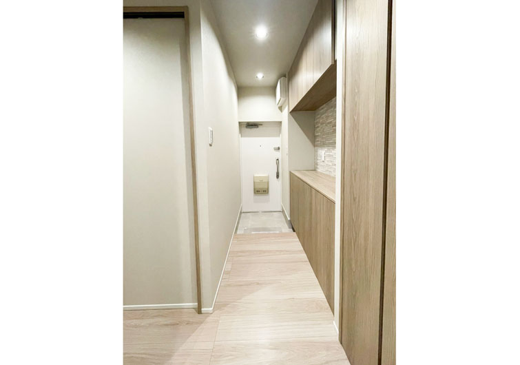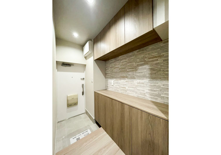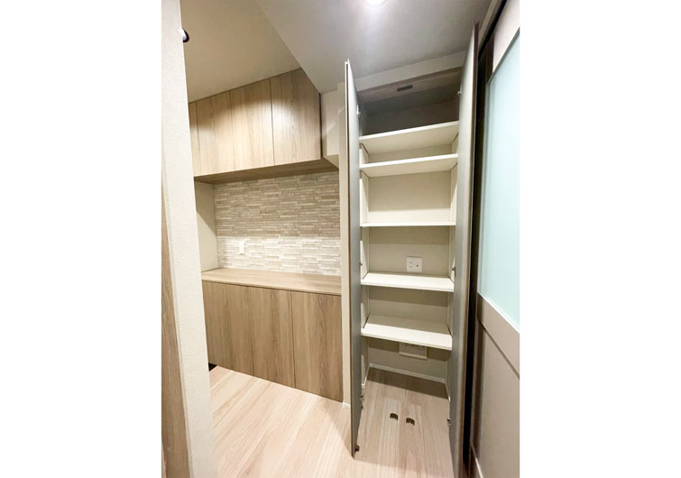 以前は壁面収納が玄関スペースを圧迫していましたが、今回の工事で「カウンター+吊戸棚」タイプの収納に変更。目線の高さに余白が生まれ、すっきりとした印象に。