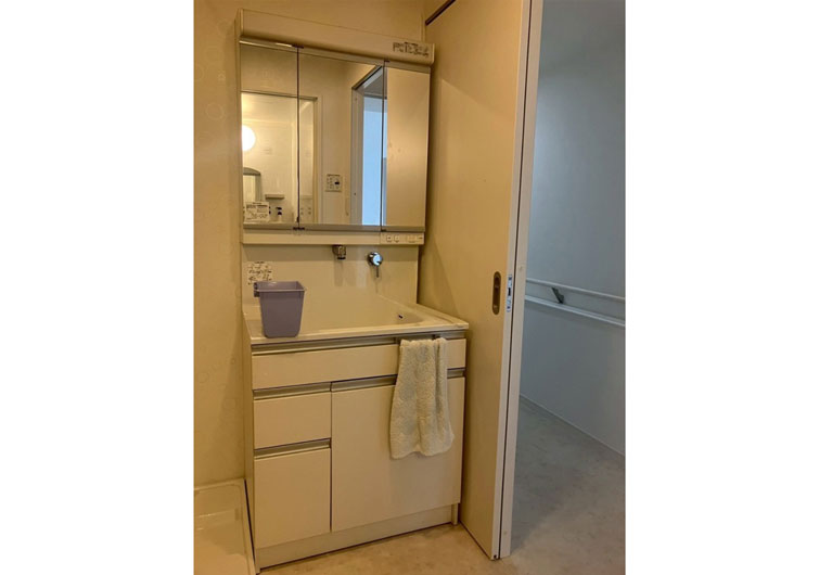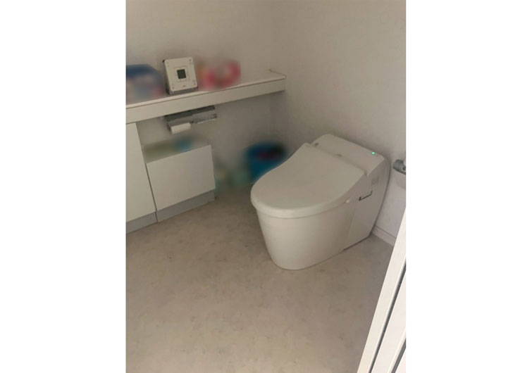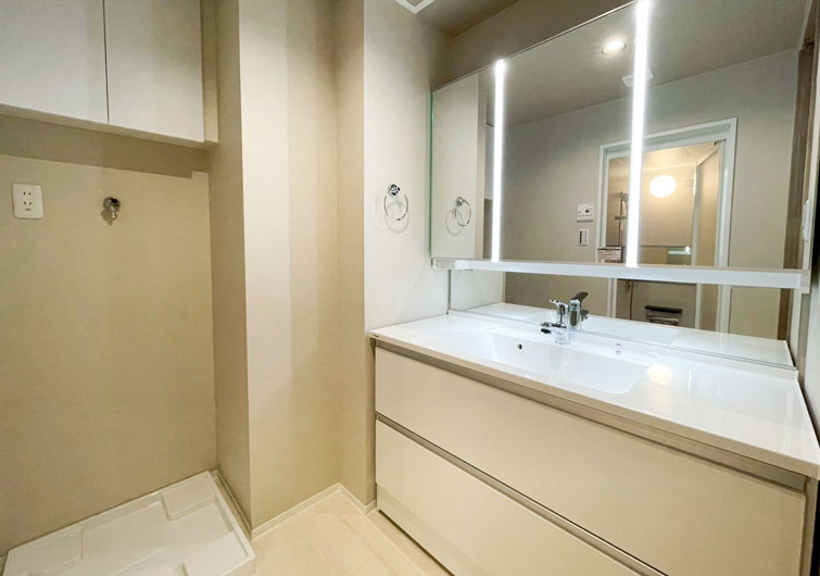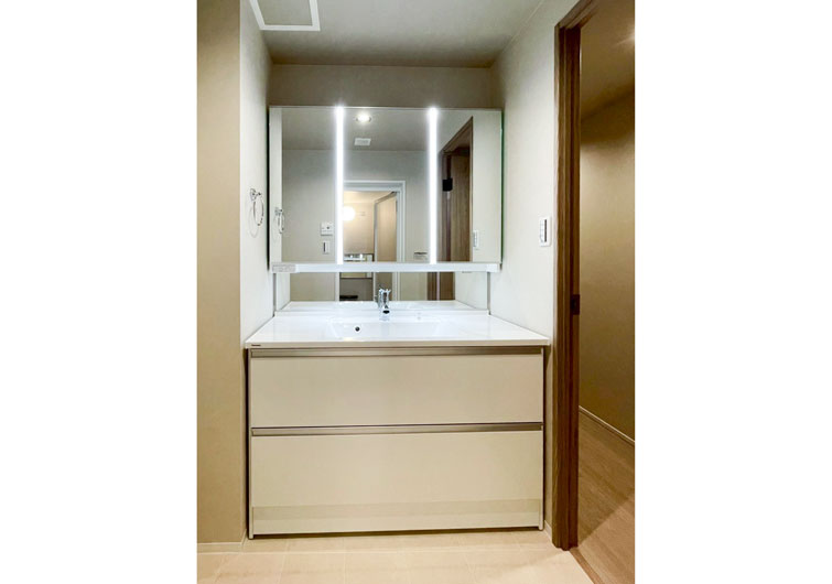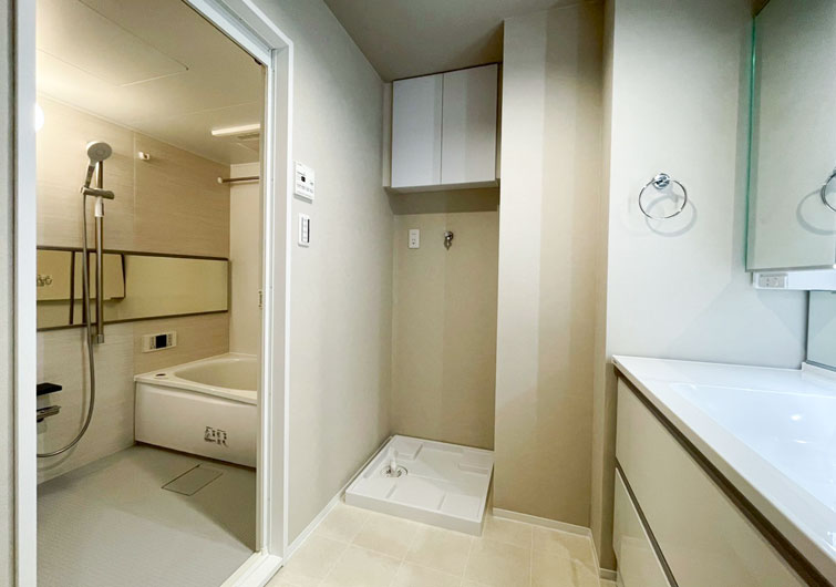 タンクレストイレを引き続き採用し、すっきりとした空間に。 手洗いキャビネットには INAX「キャパシア」(紙巻器付サイドベースキャビネット)を選びました。 座ったままゴミを捨てやすく、扉を閉じればサニタリーボックスが隠れる仕様で、清潔感と使いやすさを両立しています。