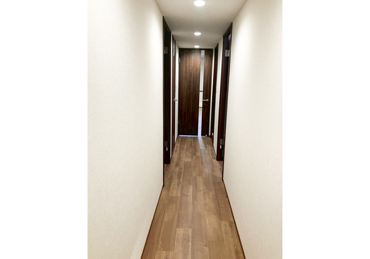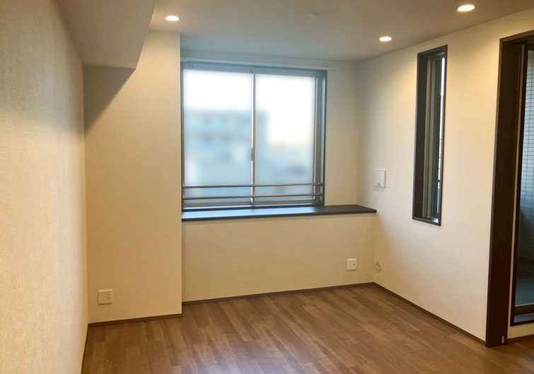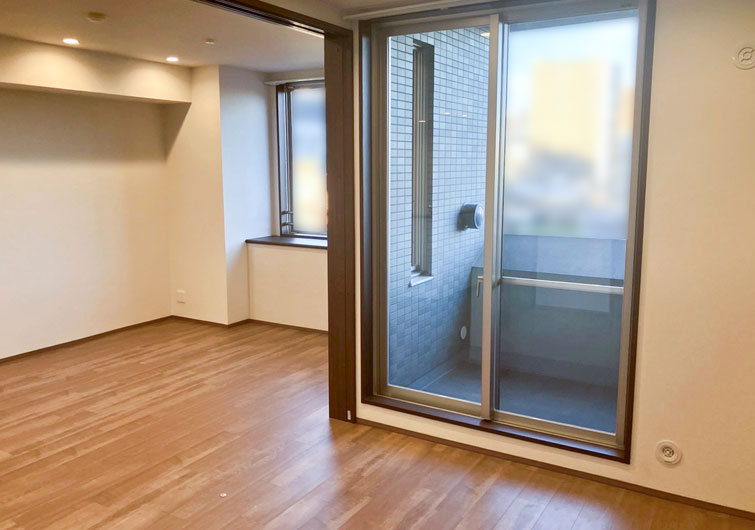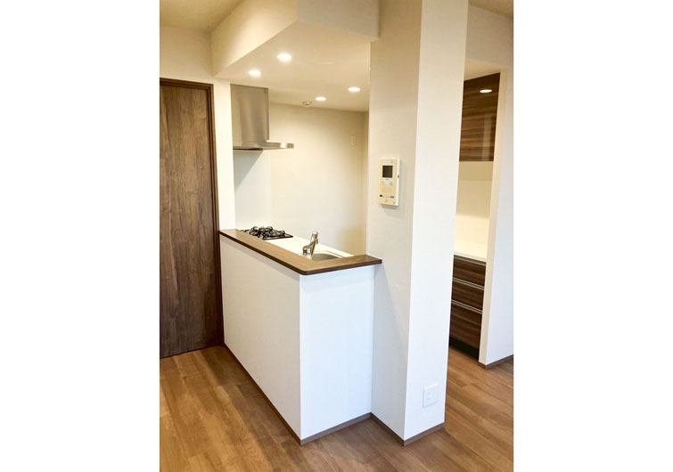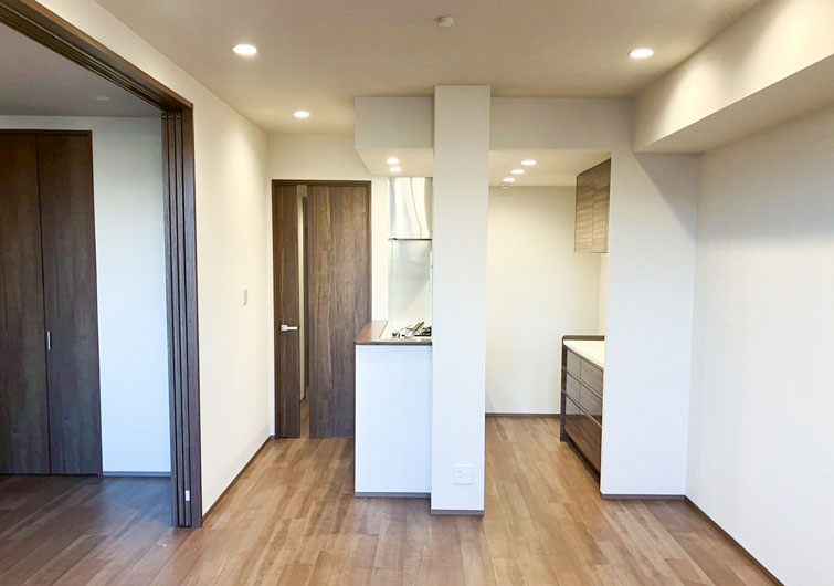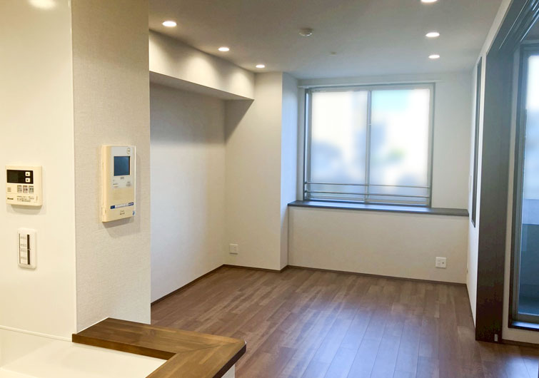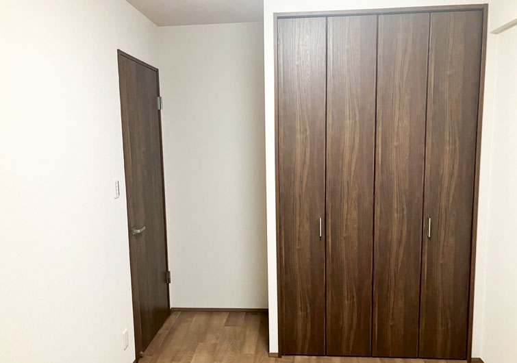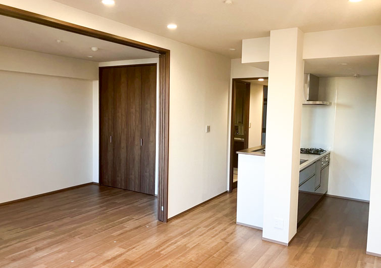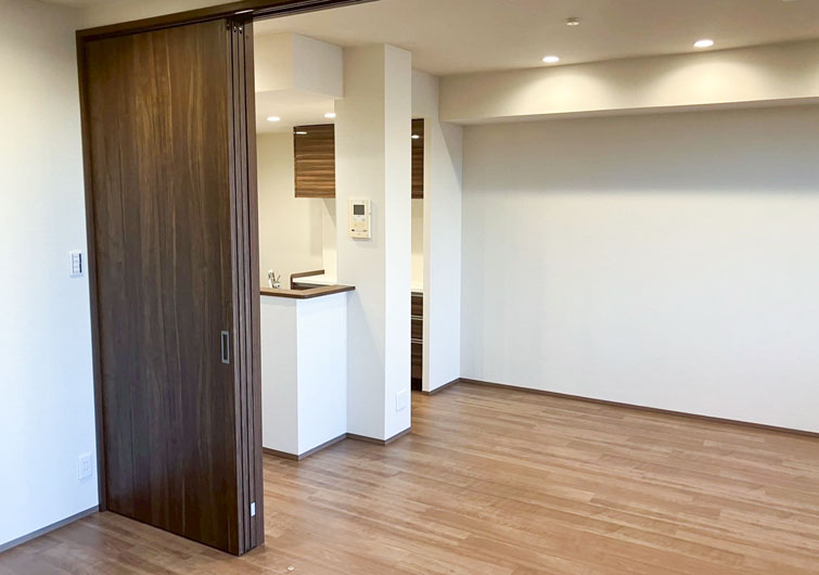 築28年のマンションリノベーション。 ブラウン×ホワイトでカラーを統一させた落ち着いた印象のお部屋が完成しました。 今回の工事でリビングに隣接した和室を洋室に変更しました。 普段は開け放してリビングとの一体感で開放感のある空間になり、来客時は間仕切り戸を閉めればプライベート空間になります。 家族の交流スペースの充実と、それぞれのプライベートも確保された住まいになりました。