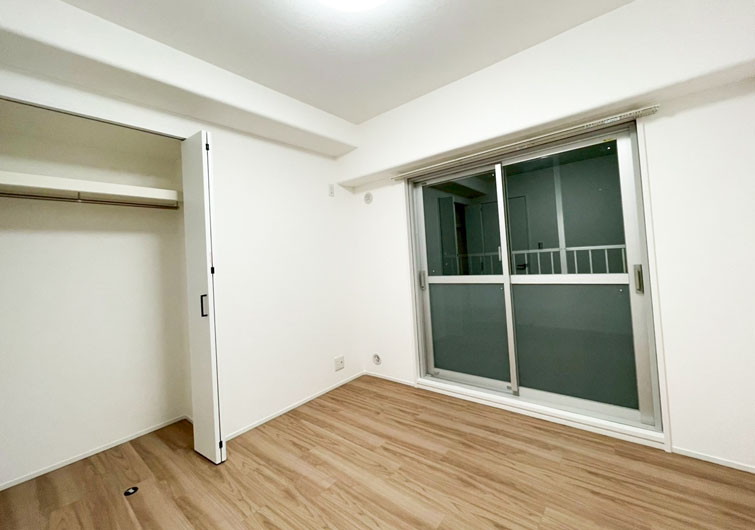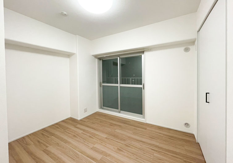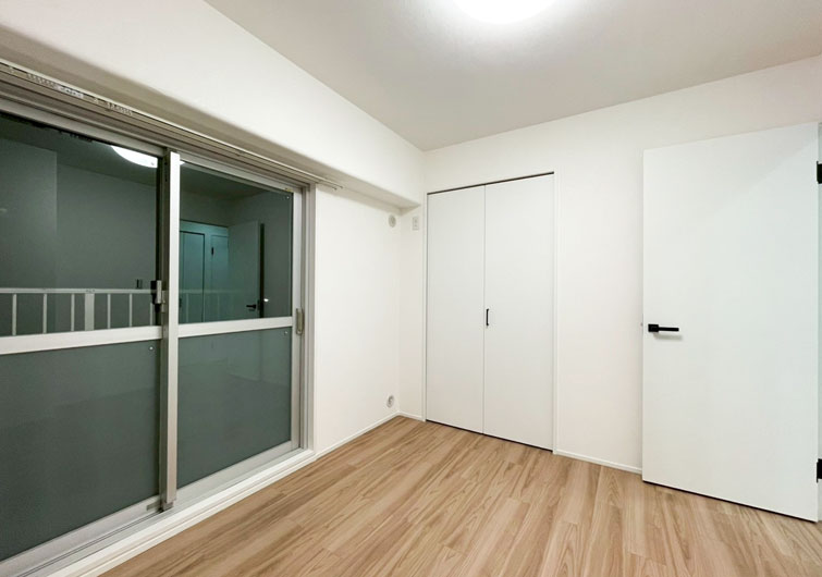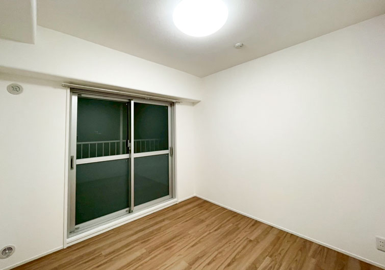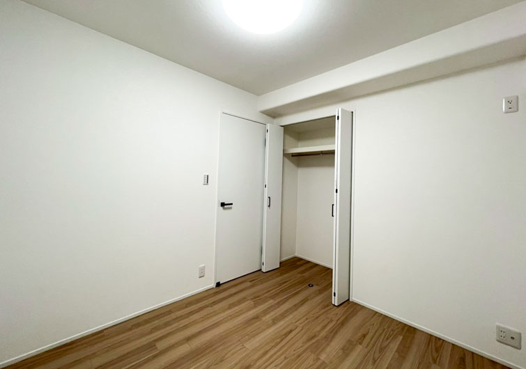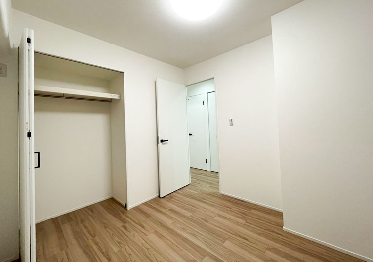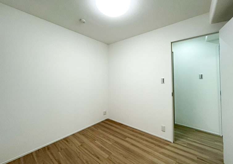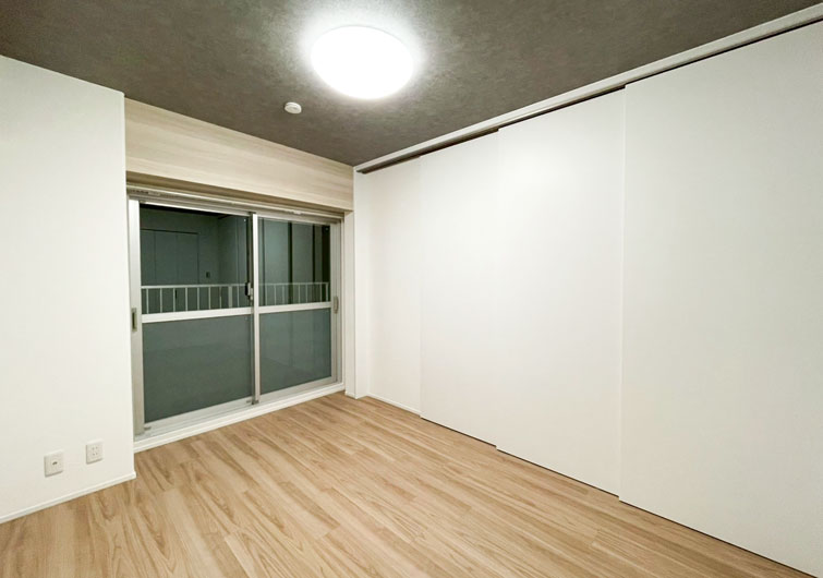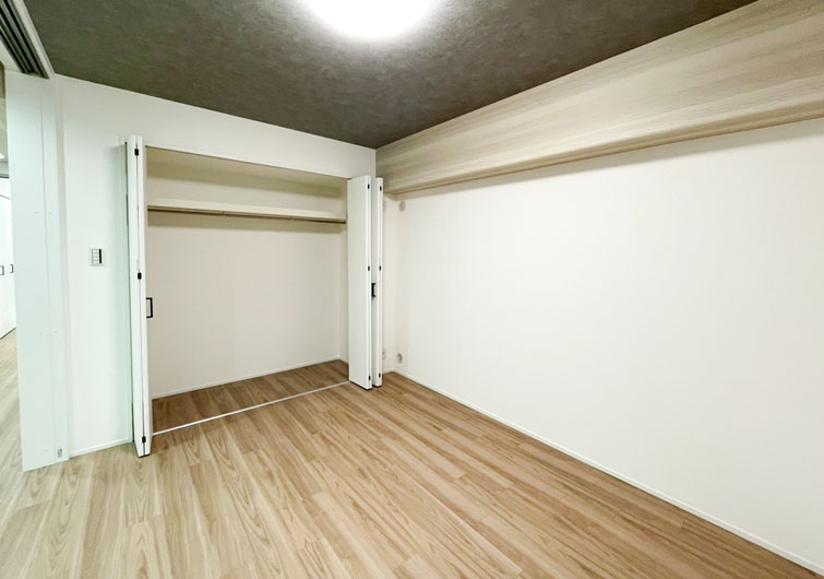 床には明るめの木目フローリングを使用し、空間全体を広く柔らかく見せています。一方で、天井にはグレー系のクロスを貼ることで、空間に奥行きとメリハリを与えています。