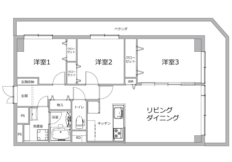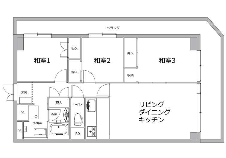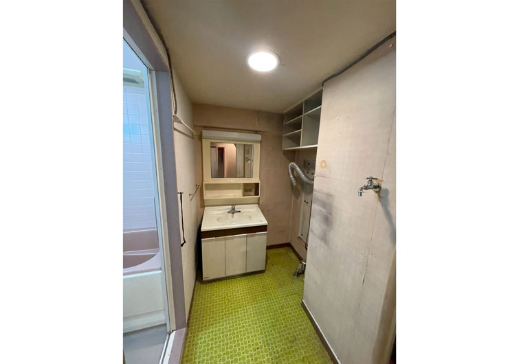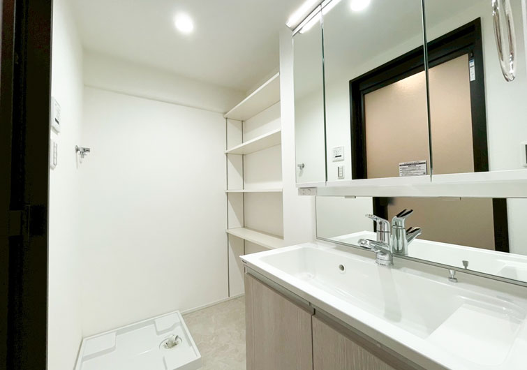 洗面室内の設備配置を変えて、使い勝手の良い動線にしました。 以前より収納スペースと洗濯機置場に余裕ができました。 ※洗面化粧台…PanasonicCライン採用