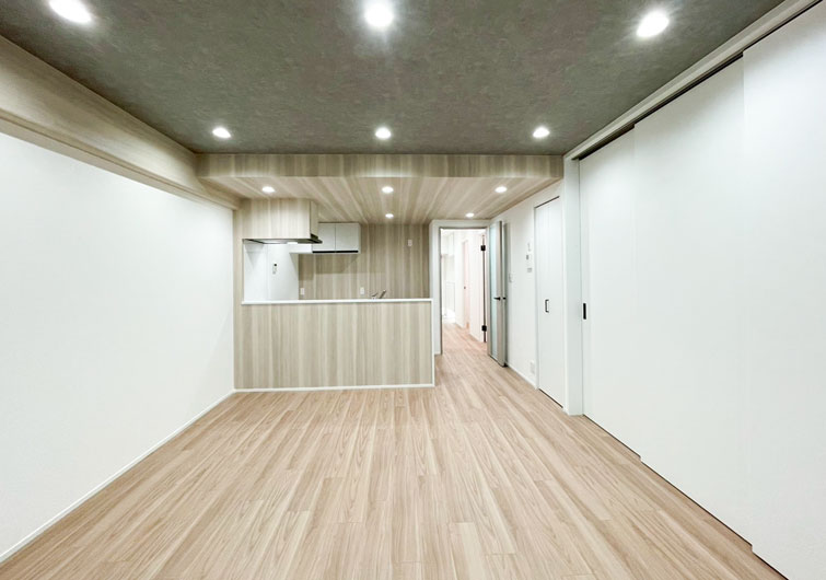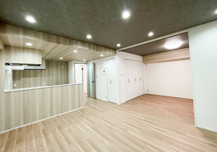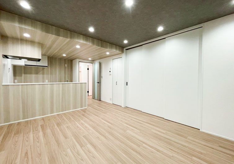 <メリット> ・空間に落ち着きを与える…暗めの天井クロスは、包まれるような安心感を演出し、リラックスできる空間になります。 ・高級感・デザイン性アップ…グレーやチャコール系のクロスを使うと、洗練された印象を与え、ホテルライクな雰囲気を作り出します。 ・照明の演出効果が高まる…間接照明やダウンライトの光が映え、よりドラマチックな空間演出が可能です。 <デメリット> ・天井が低く見える可能性…暗い色は収縮色のため、場合によっては圧迫感を感じることがあります。 ・部屋全体が暗く感じる場合も…照明の配置や明るさを工夫しないと、昼間でも少し暗い印象になることがあります。 今回のリノベーションのように、床・壁・天井の色バランスを工夫すれば、暗めの天井クロスでも「おしゃれで落ち着く空間」を実現できます。 ナチュラルさとモダンさを両立したい方に特におすすめのデザインです。