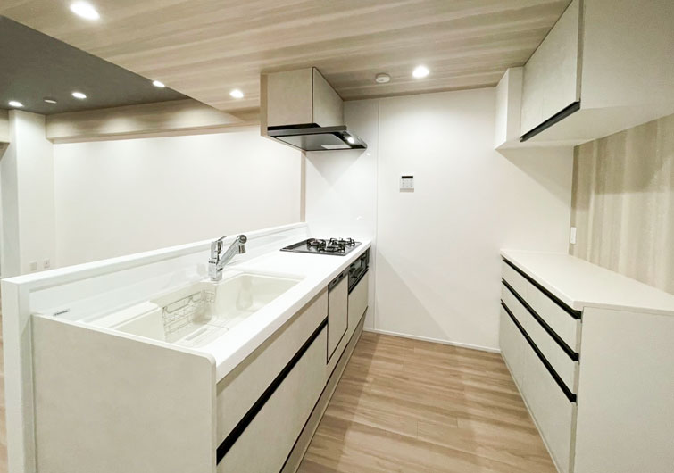キッチンはオープンタイプの対面式で、白を基調とした清潔感のある仕上がり。料理中でもリビングとのつながりを感じられ、家族とのコミュニケーションが自然に生まれる設計です。