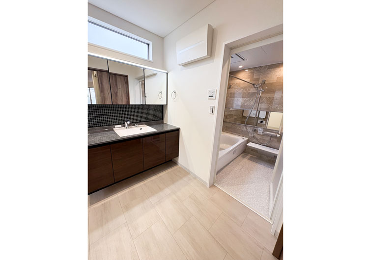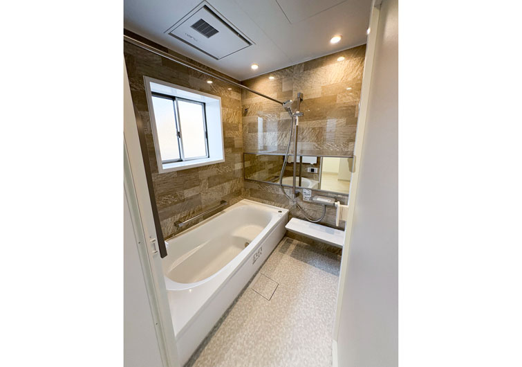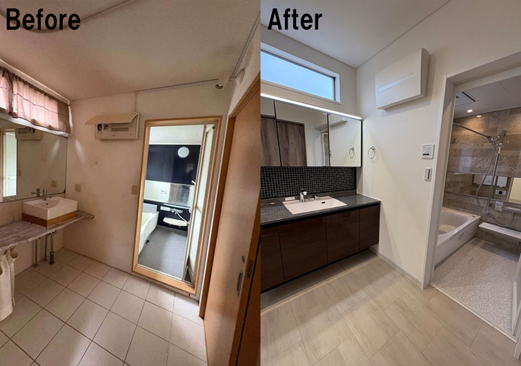 既存の浴室を解体し、洗面室の床高さに合わせて新しいユニットバスを設置。 段差がなくなりすっきりした印象になりました。 ※洗面化粧台…リクシル/ルミシス、バス…TOTO/サザナ