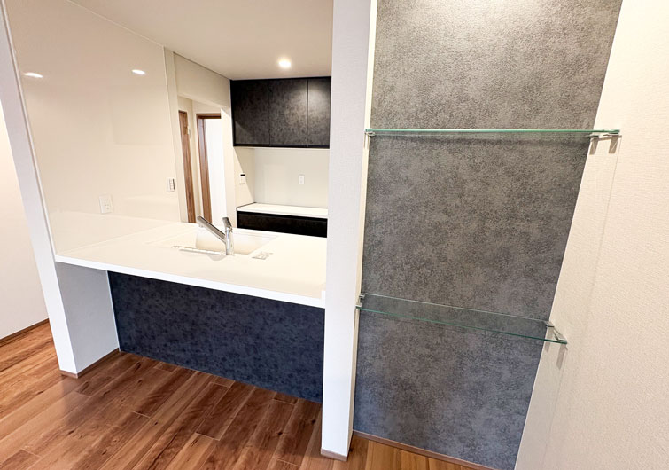 キッチン裏側の壁面にはニッチ風のスペースを設け、インテリア小物などを飾ることができる、機能的かつおしゃれなポイントに。