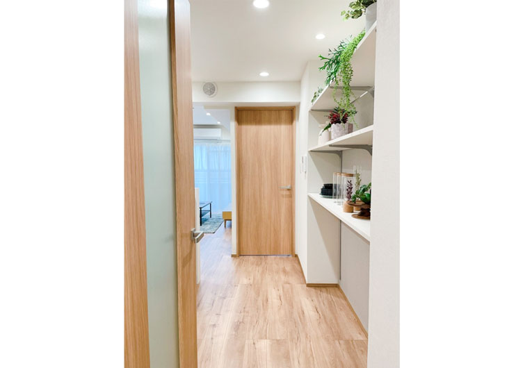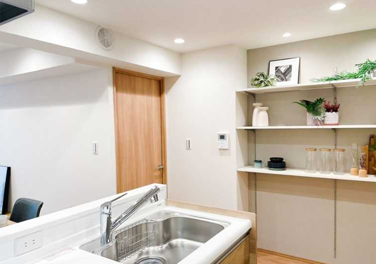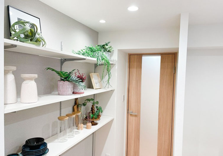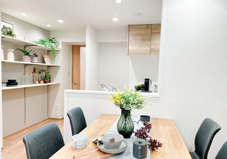 また、壁にオープン収納を設け、インテリアを楽しめるダイニングが完成しました。