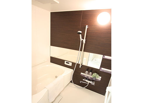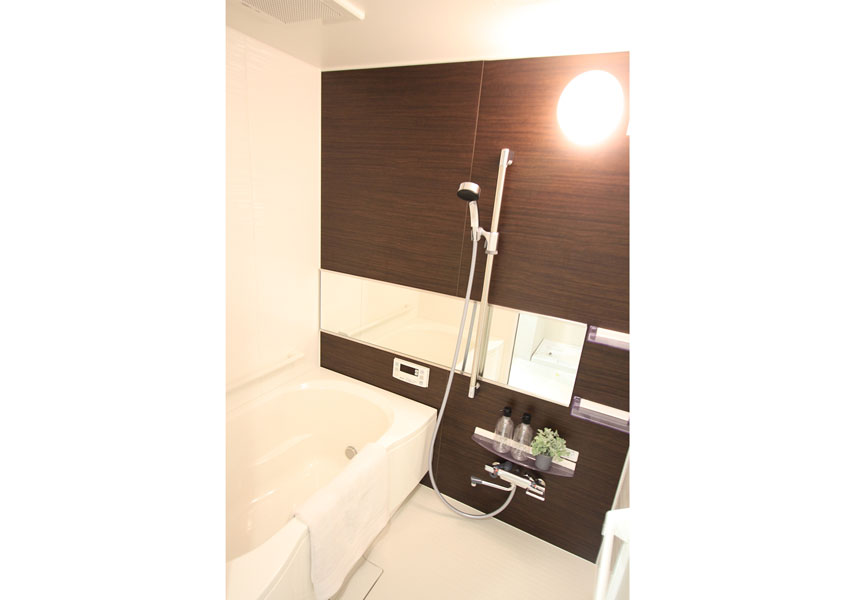落ち着いた茶色で床や建具、キッチンパネルや浴室等、、細かいところまでこだわり、統一させました。