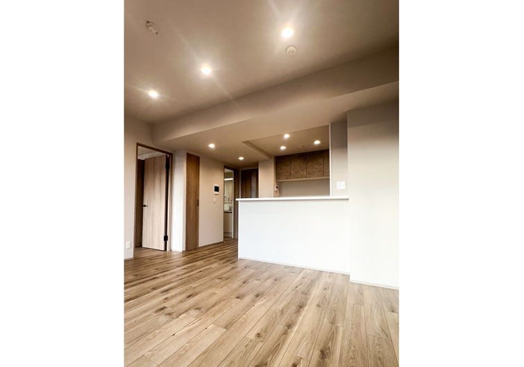リビングは木目のフローリングとダウンライトの柔らかい灯りが心地よく、キッチンとの一体感も抜群。開放的でありながらも落ち着いた空間に仕上がっています。