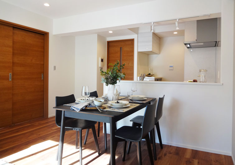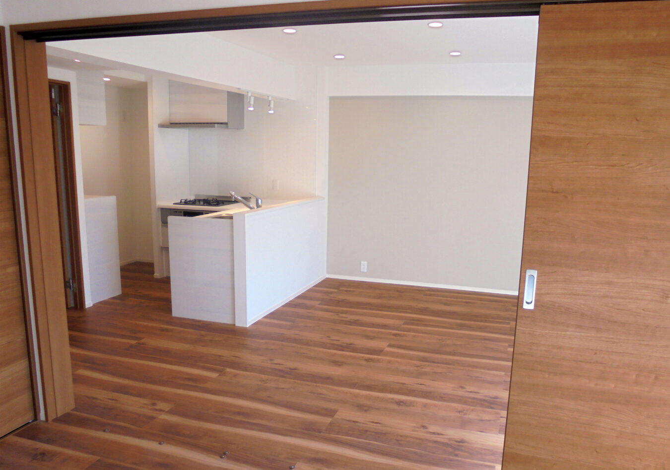 リビングと接する部屋は洋室に変わり、レールが床にない引き戸タイプの扉で溝がない分お掃除もしやすく床の境もないので空間にしきりがなく広く感じられますよね。