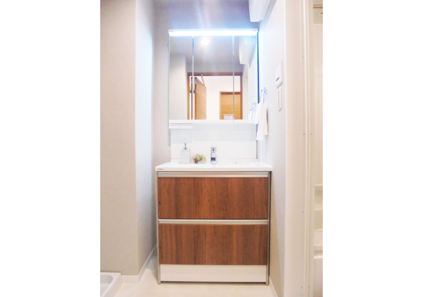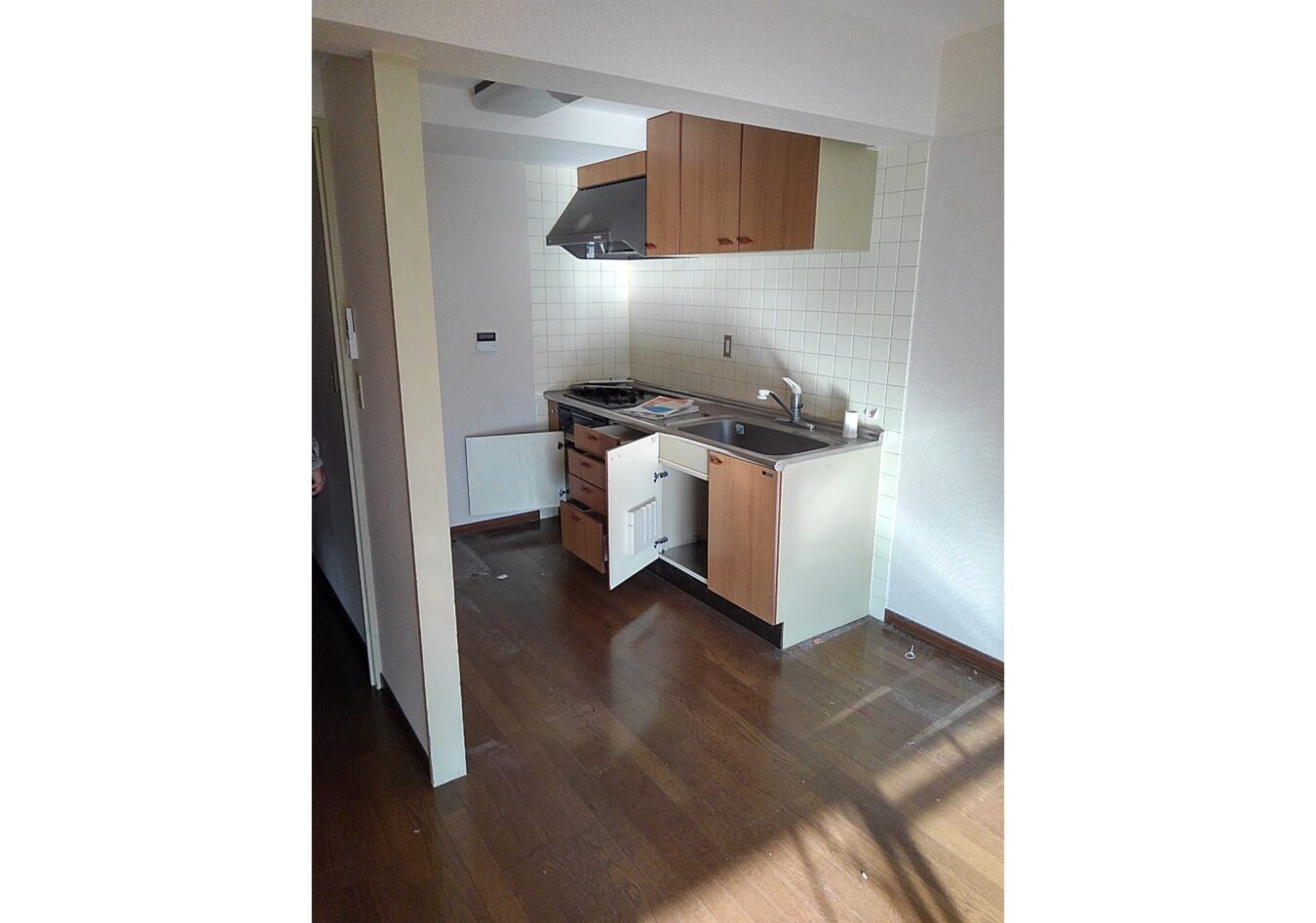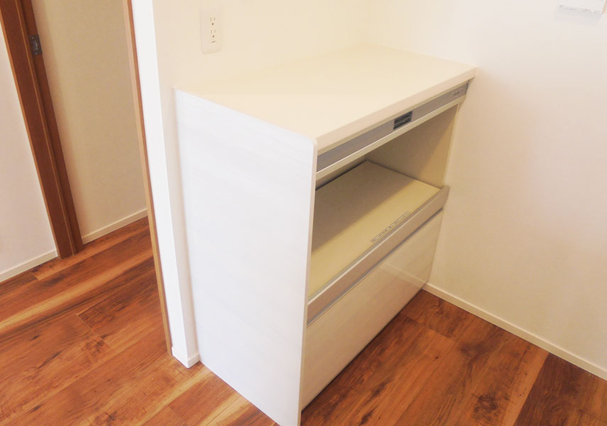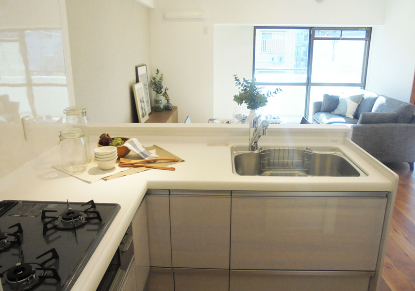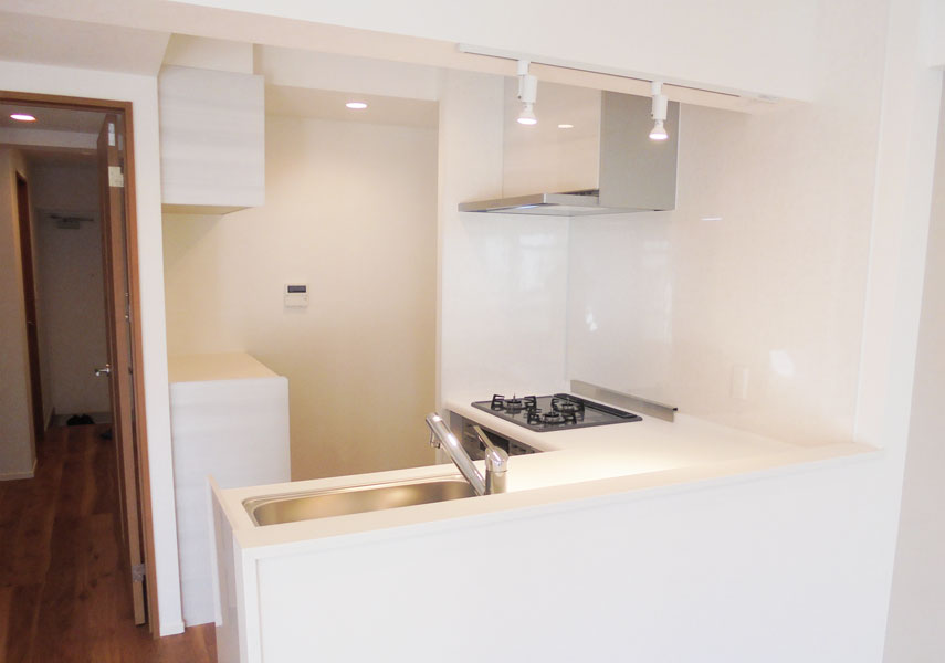奥にあったキッチンをリビングに方向を変えて対面式のキッチンに変えました。奥には冷蔵庫置場を設けたので、来客には見せたくない冷蔵庫の中も視界に入らず見えません。調理家電が置ける棚もキッチンパネルに合わせて設置したので統一感を感じすっきりとした印象になります。ベランダの方から差し込む日の明かりが、部屋全体とキッチン奥まで広がる明るい空間にパワーアップしました。