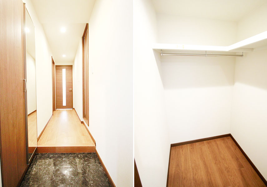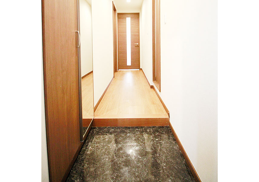 家の顔となる玄関は大理石のようなフロアタイルで高級感漂う玄関に。下駄箱は全身鏡付きの大容量のものにして家族全員の靴がしまえすっきりとした玄関にできるようになりました。