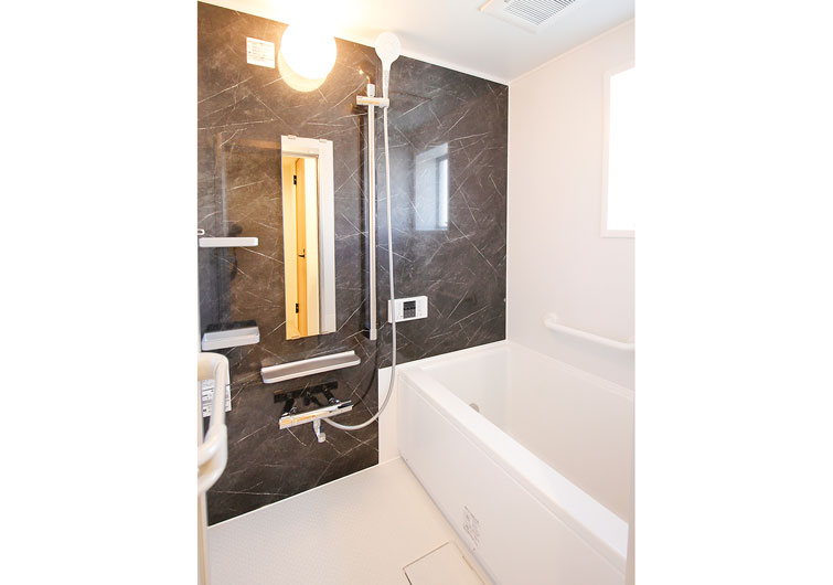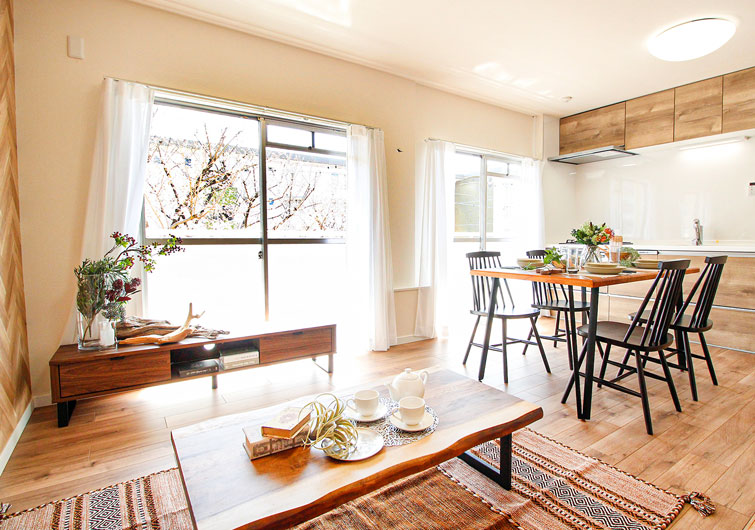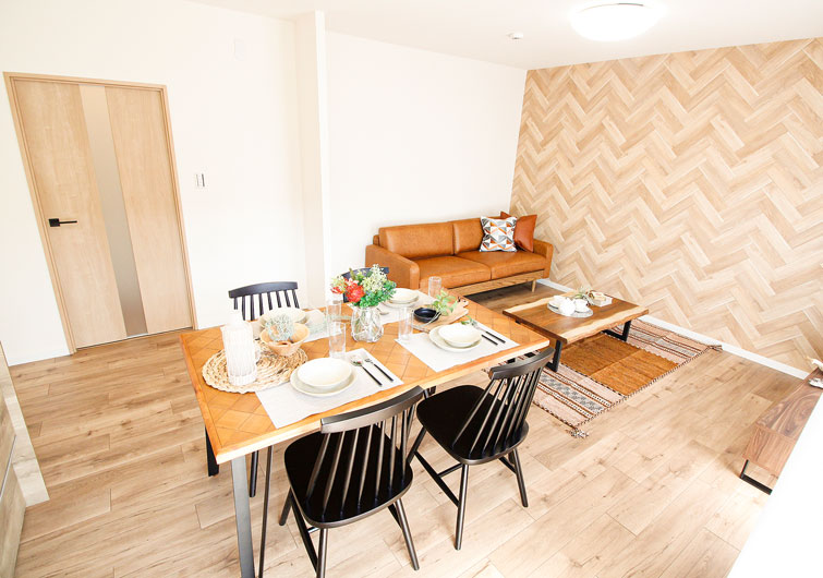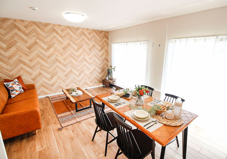 光と風が隅々まで行き渡る明るく開放的なリビングの一部にヘリンボーン柄を取り入れ、親しみが感じられるおしゃれなデザインがアクセントのお部屋が完成しました。