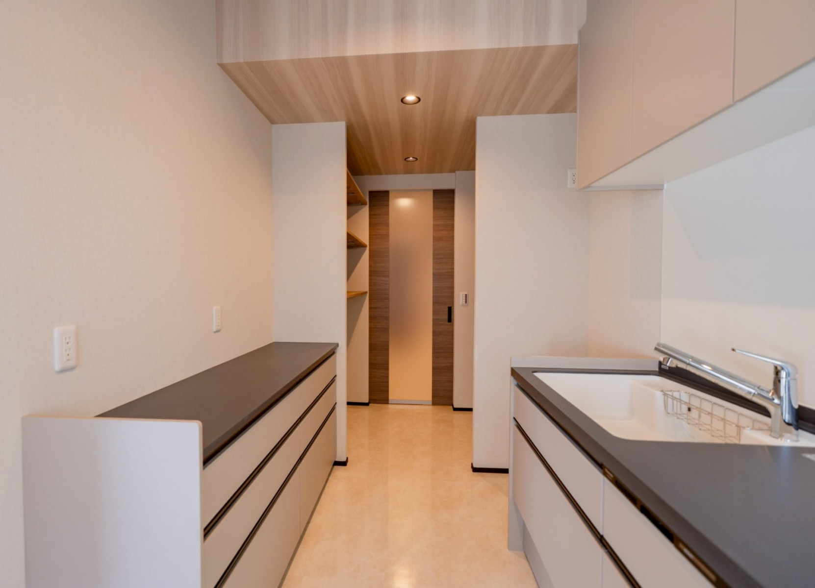 キッチン内にはパントリーを設け、食材や日用品をすっきりと収納できる設計に。作業スペースを広く確保しながら、生活感を表に出さない工夫がされています。