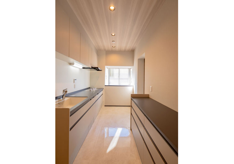 キッチン全体は直線的で無駄のないレイアウトとし、扉や天井にはやわらかな木目調を採用。