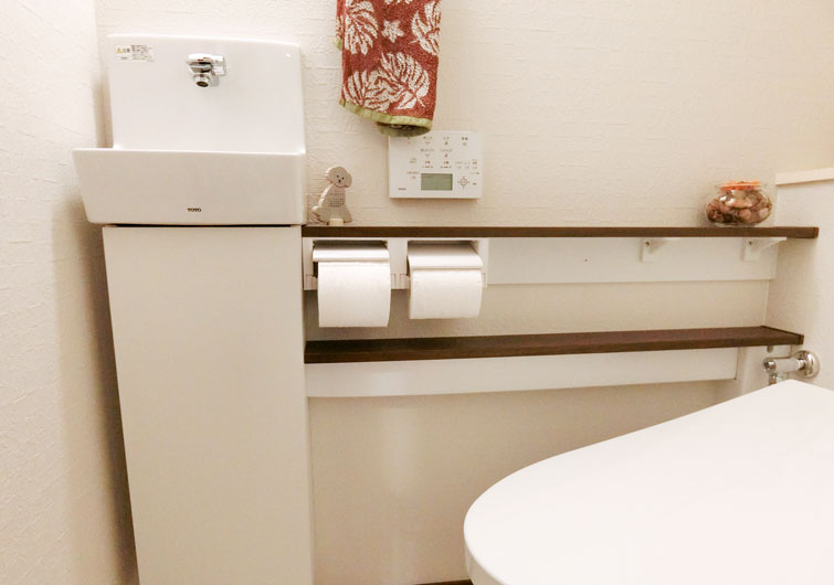 手洗い器付きのものがご希望で、せっかくトイレを変えるなら。。。と既存とは違うタンクレストイレに変更。